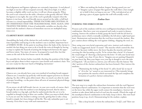 REMEDY: Watch the student from a profile viewpoint. Often it is visually obvious that only the very tip of the mouthpiece (and reed) is in the mouth or that extreme pressure is being exerted against the reed Most of the time your comment will be: “Take a little more reed in your mouth.” The extreme pres- sure problem is less likely unless the student breaks out of the “A-Q” position. (See BUNCHED CHIN)