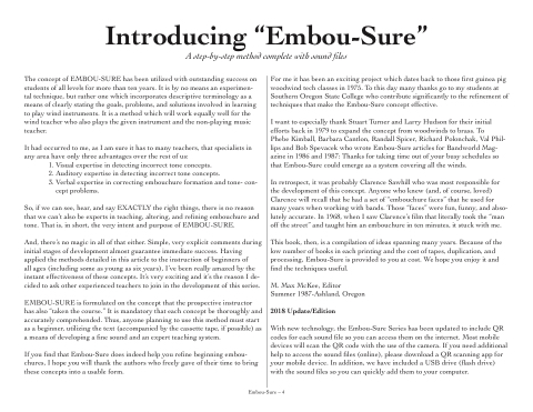 Stuart Turner’s Tuba Embou-Sure appeared in the first issue of Bandworld Maga- zine in August 1985. In Novem- ber of that year, Larry Hudson’s Trumpet Embou-Sure was featured. Max McKee’s Clari- net Embou-Sure was published in two segments: January and then March 1986. May 1986 featured flute and horn. Novem- ber 1986 contained saxophone, while March 1987 brought both bassoon and trombone-baritone. The set was completed with Barbara Cantlon’s Oboe Embou-Sure in May 1987.